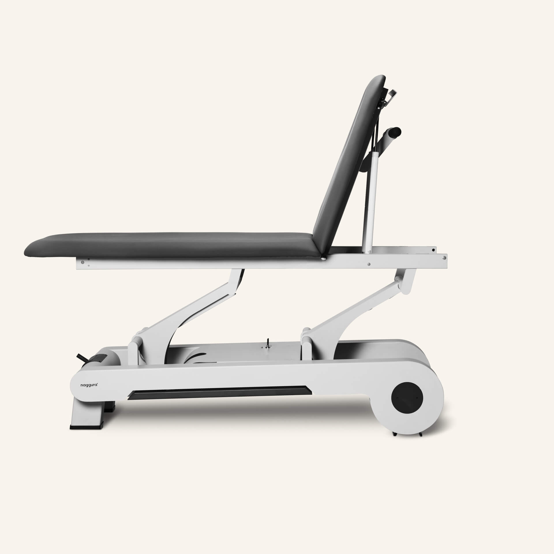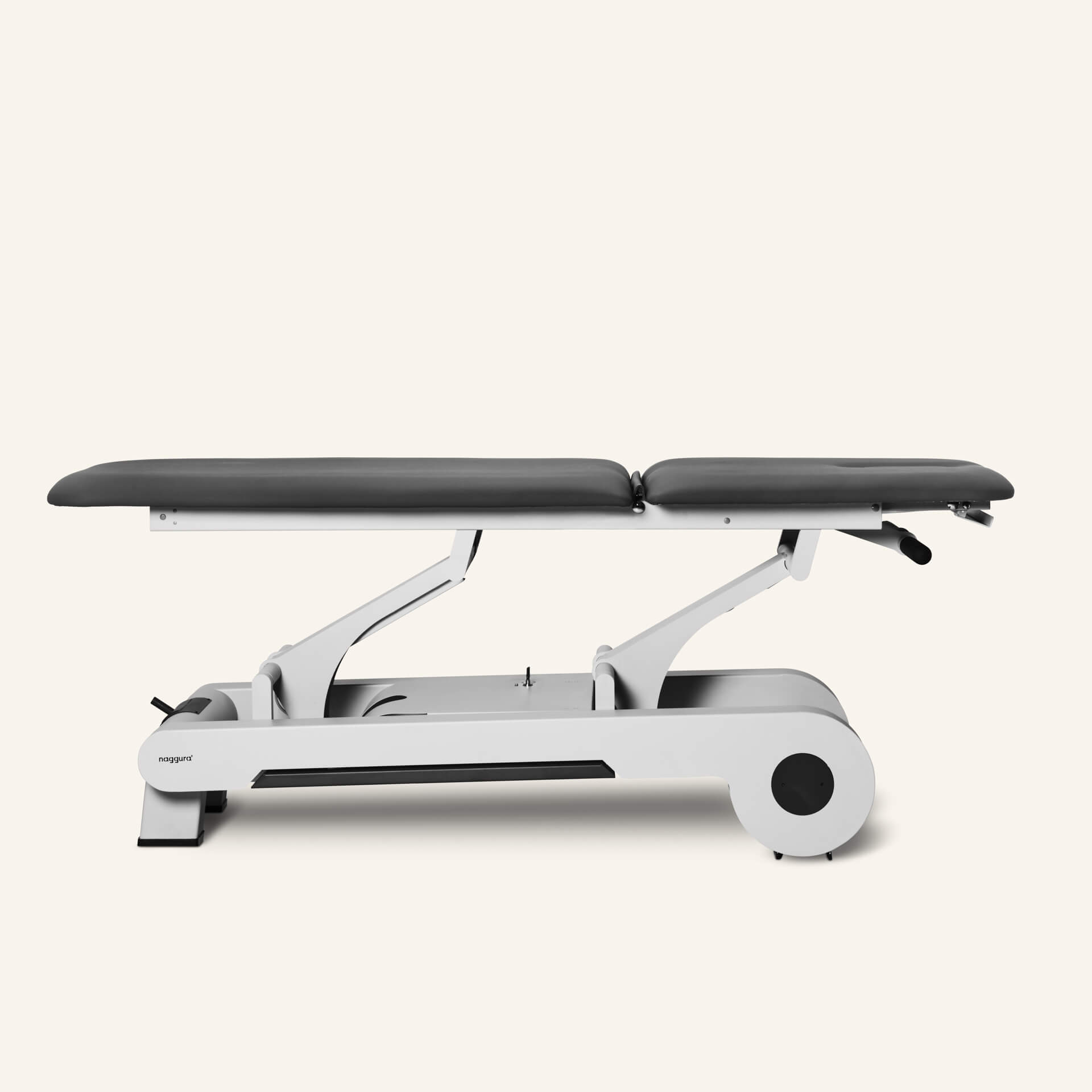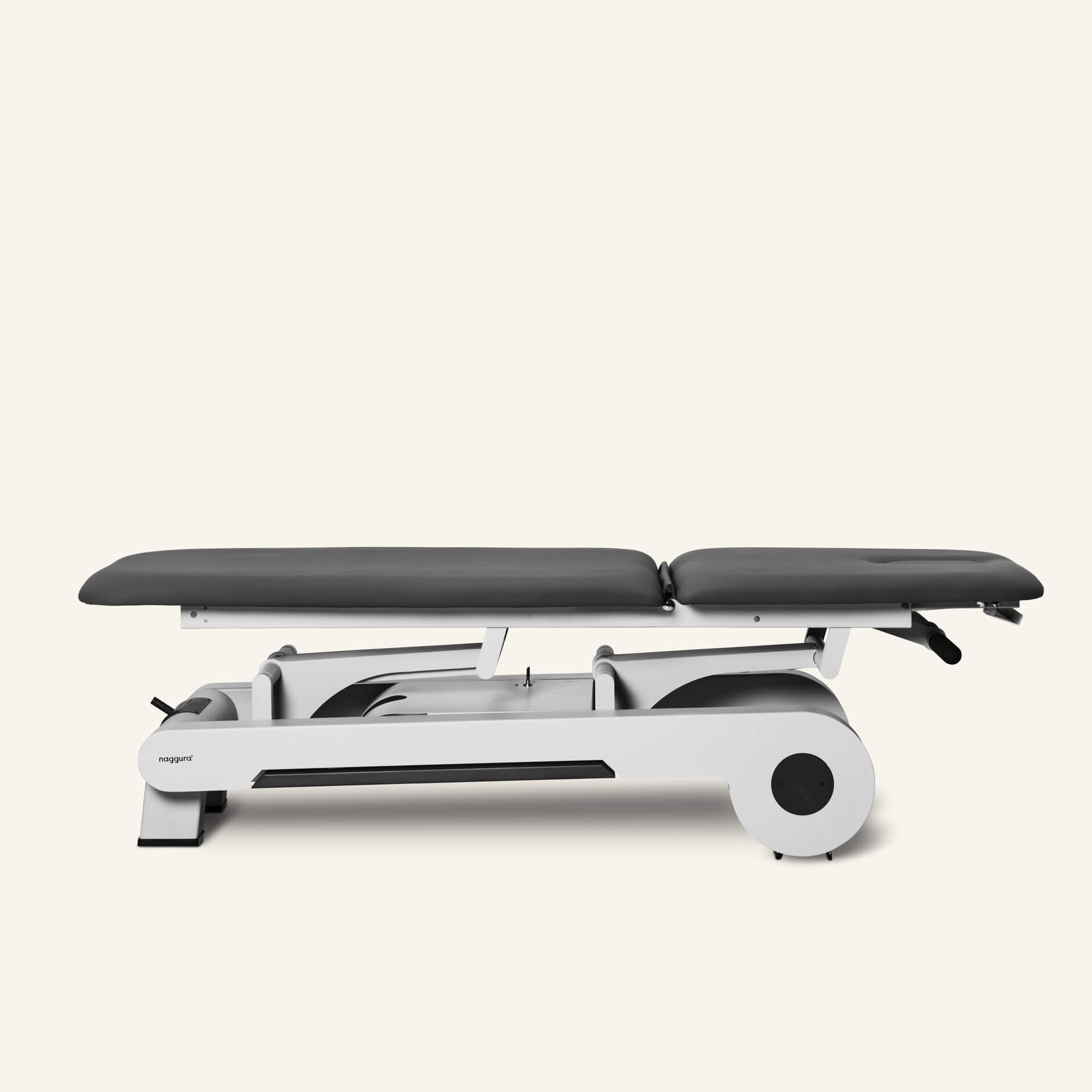 Electric 2-section table with a long headrest, ideal for semi-sitting treatments. Features perimeter control accessible from all sides and 360º swivel wheels for enhanced ergonomics.