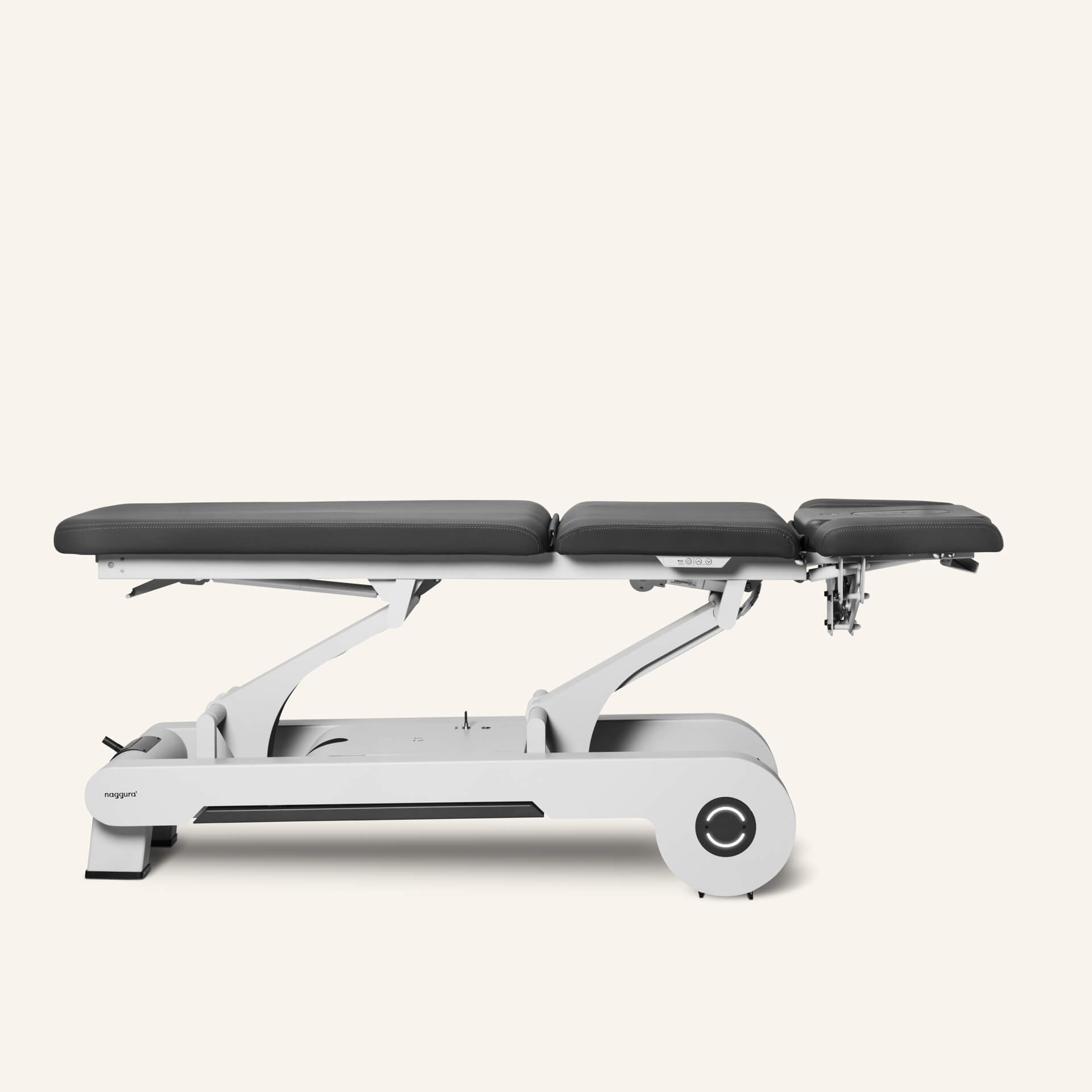 Electric 5-section table with 2 motors, height and center section adjustment, headrest armrests, foldable midsection armrests, and integrated heating for total comfort.
