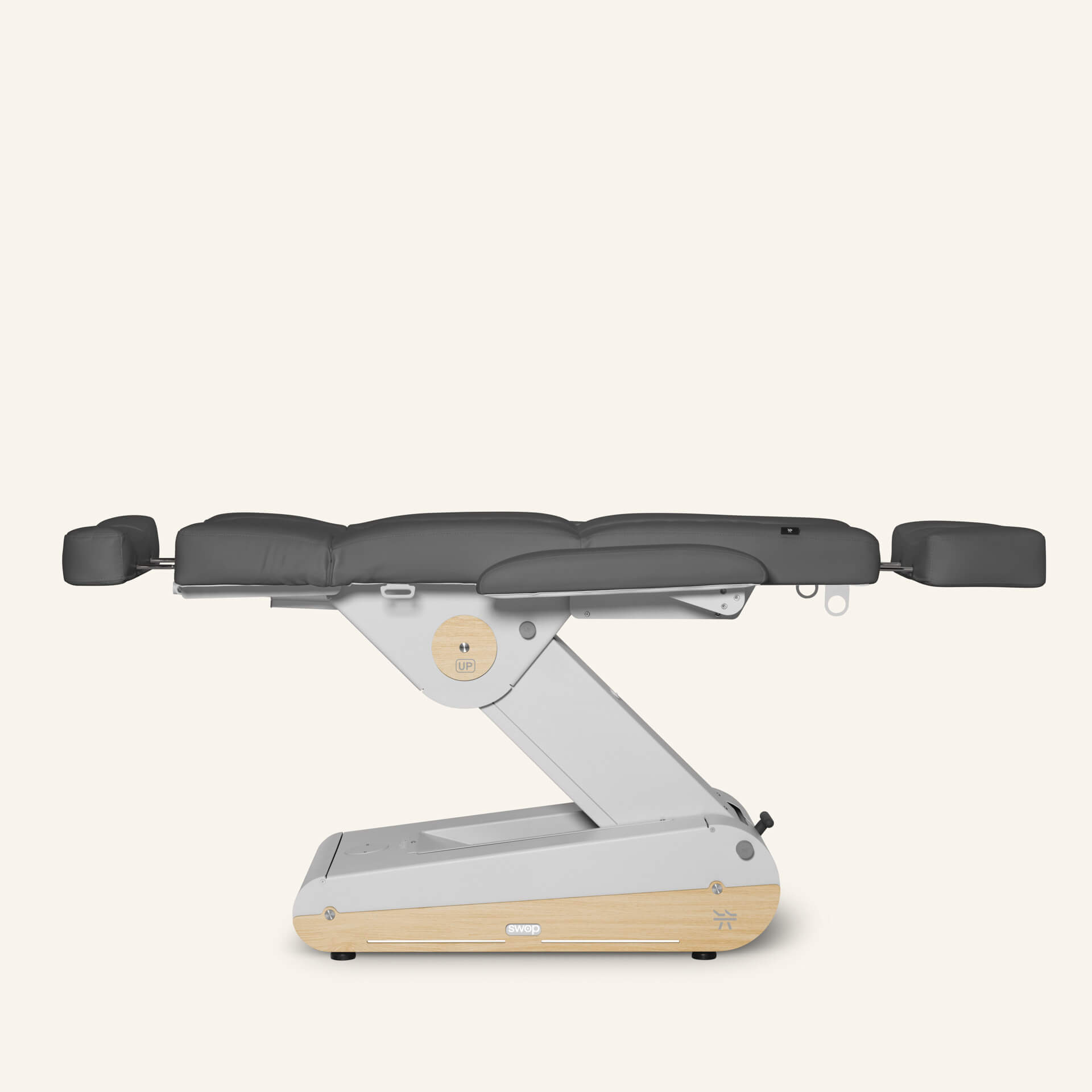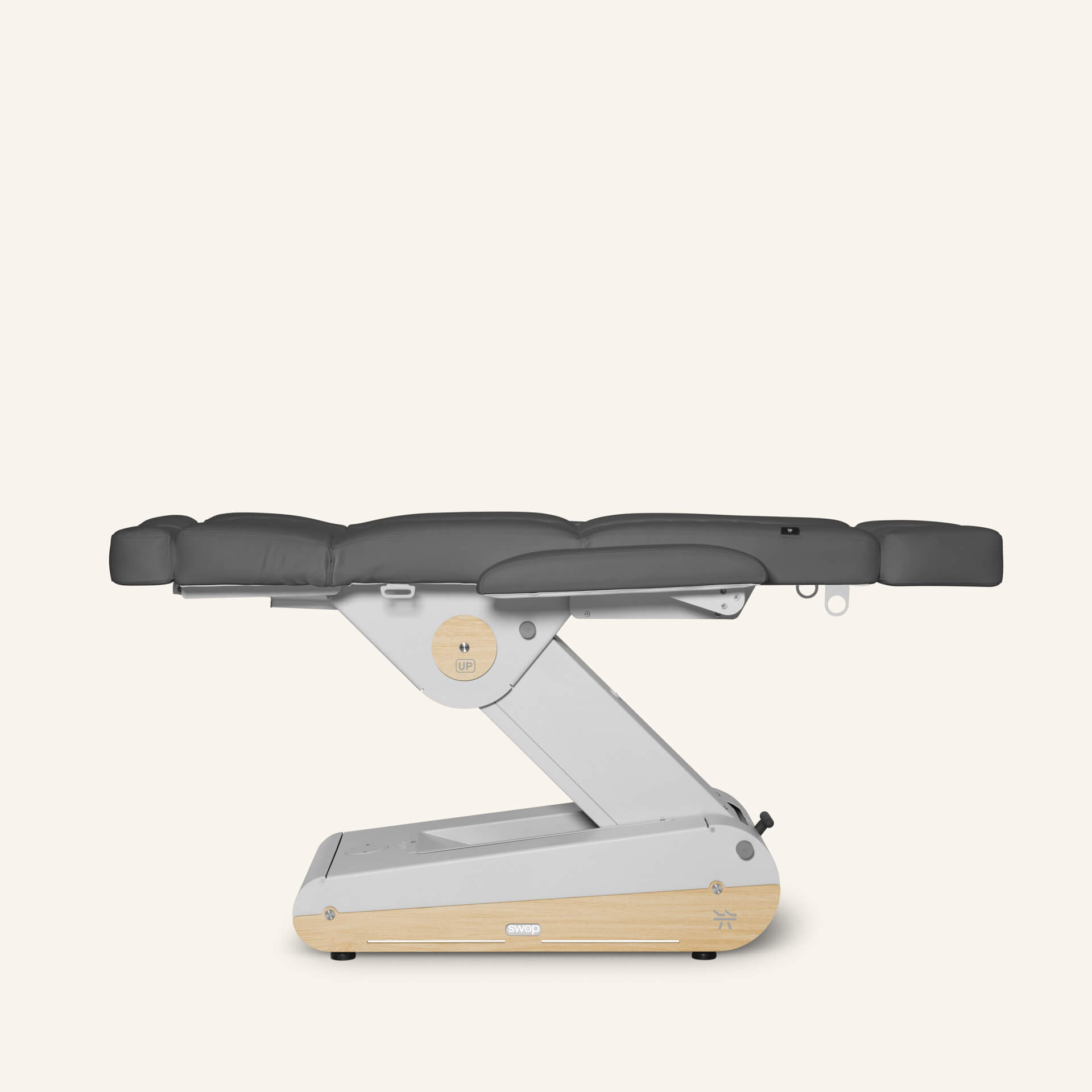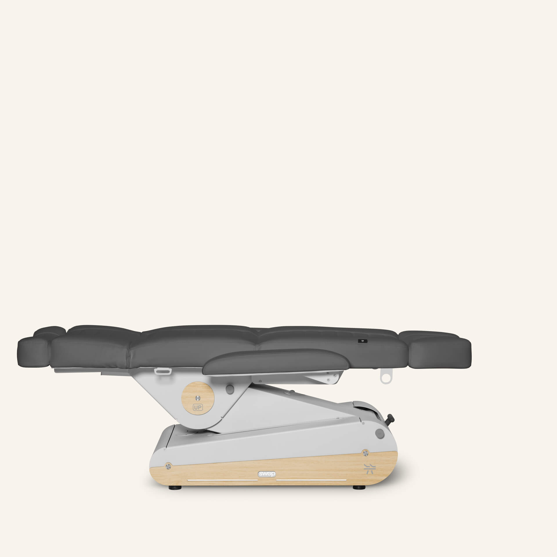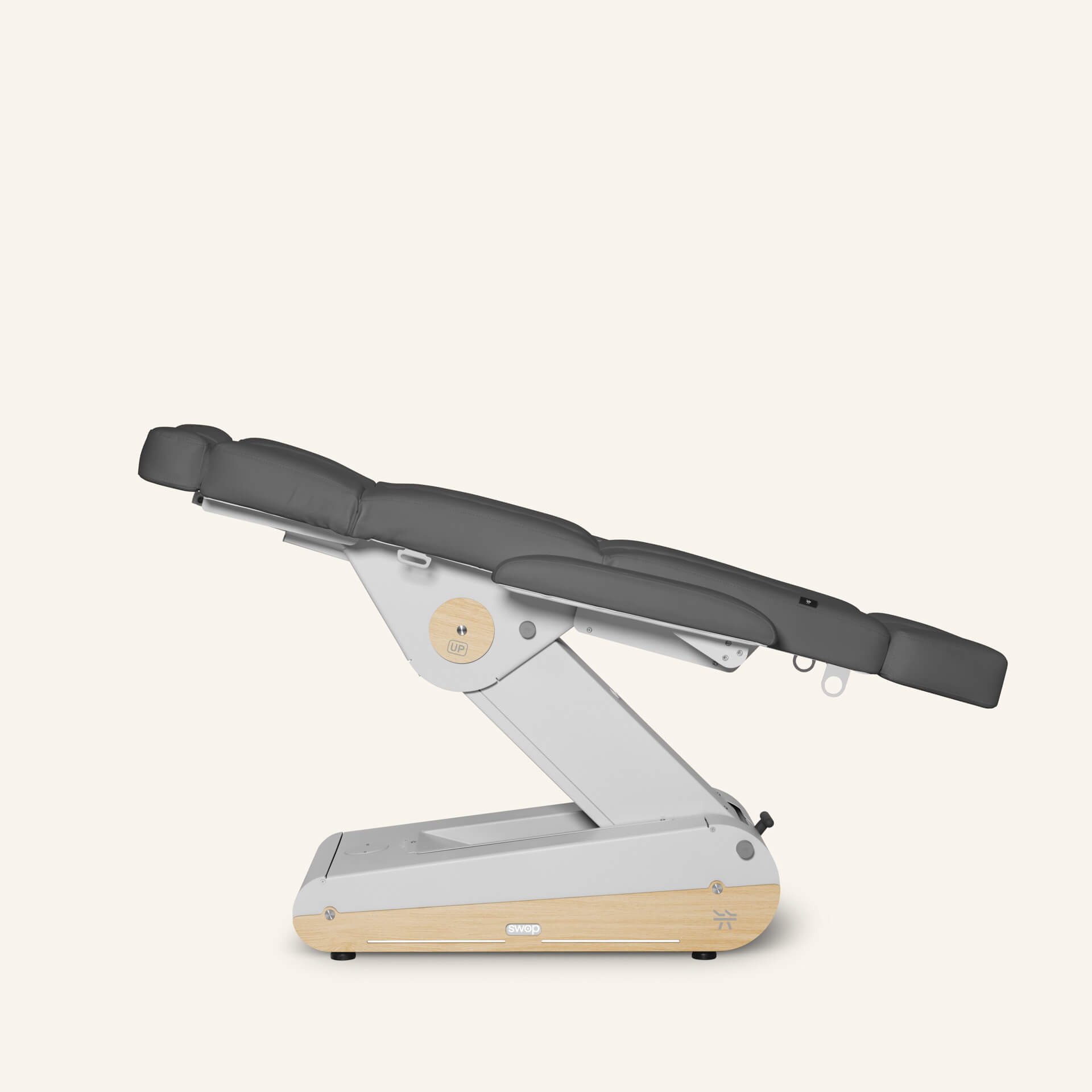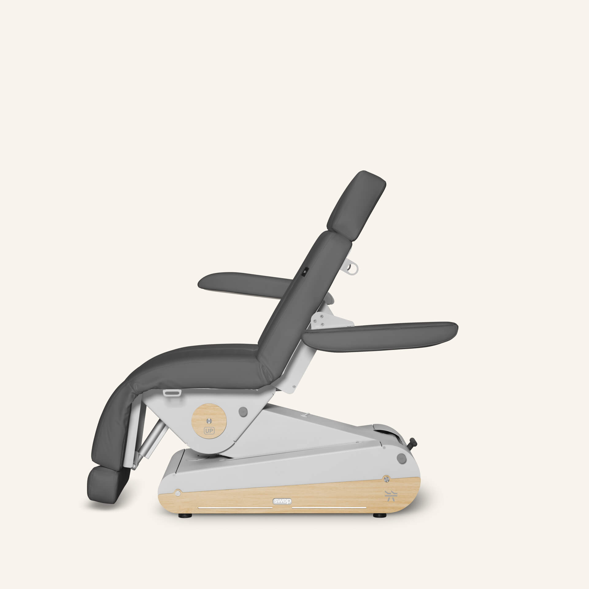 High-end aesthetic bed-chair equipped with 4 motors and a control handset, designed to deliver an exclusive wellness experience. Features foldable and removable armrests, extendable legrest, facial hole with ergonomic cushion, and integrated heating. Its Soft Skin upholstery, combined with a denser and more comfortable mattress, surrounds the patient in absolute relaxation. Ideal for treatments requiring precision, elegance, and maximum comfort.