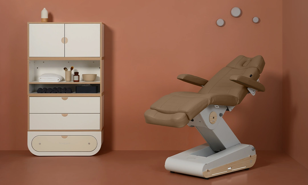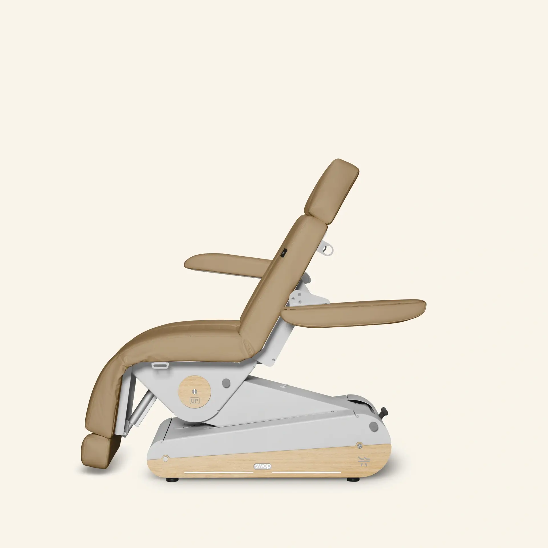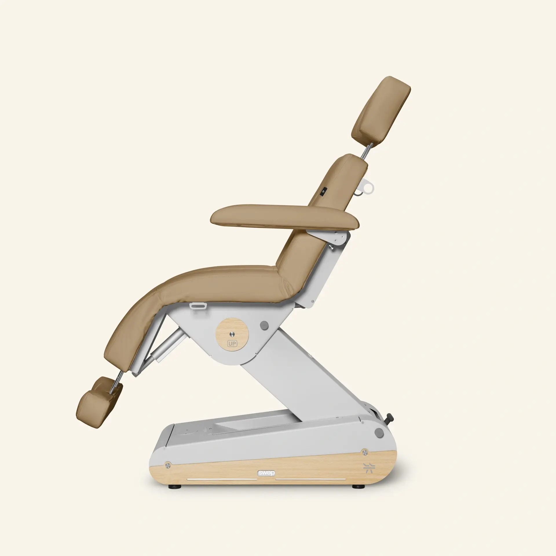 High-end aesthetic bed-chair equipped with 4 motors and a control handset, designed to deliver an exclusive wellness experience. Features foldable and removable armrests, extendable legrest, facial hole with ergonomic cushion, and integrated heating. Its Soft Skin upholstery, combined with a denser and more comfortable mattress, surrounds the patient in absolute relaxation. Ideal for treatments requiring precision, elegance, and maximum comfort.