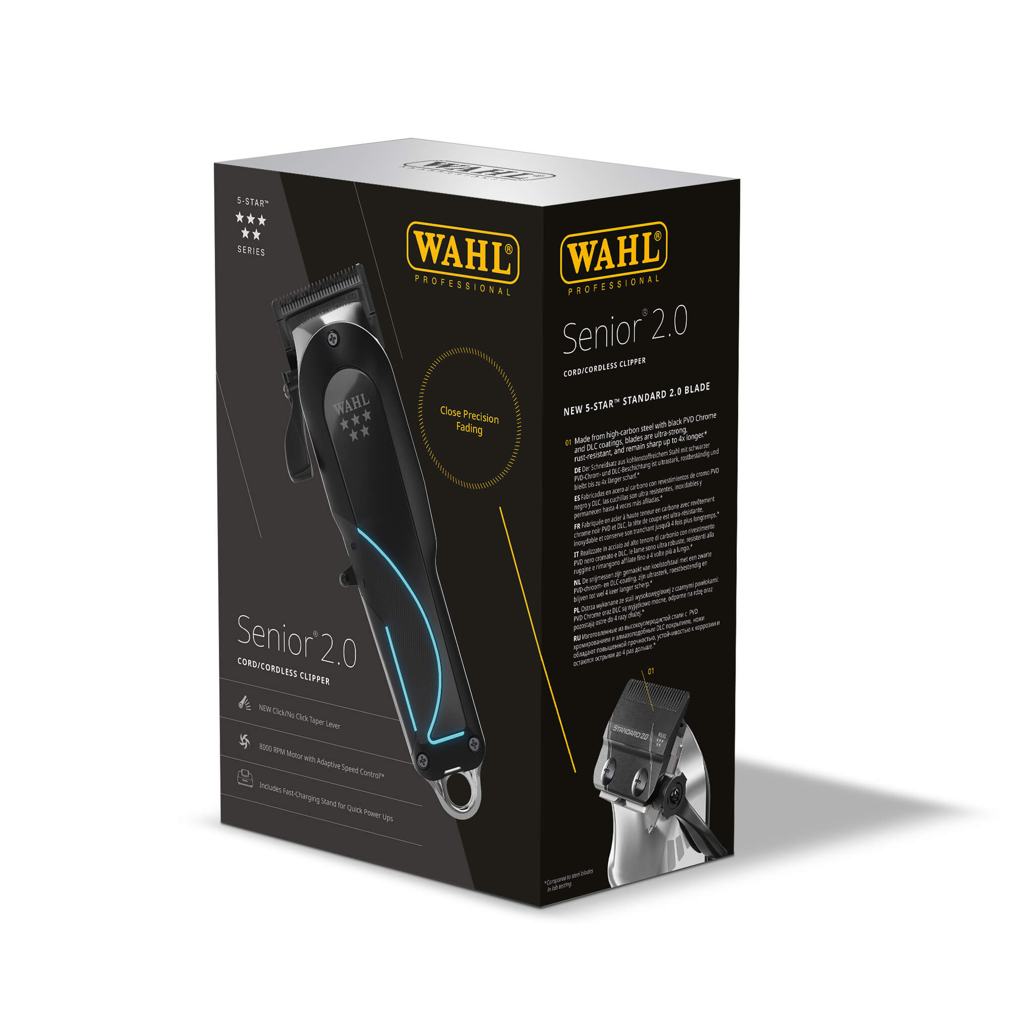 The Senior® 2.0 features a stronger motor than the original Senior. With Adaptive Speed Control™ and a 5-position lever that can also be set in a "freeflow" mode. The blade is made with an ultra-strong carbon steel alloy, the blades are DLC coated, designed to provide seamless fades, bulk removal, and taper-to-fade performance.