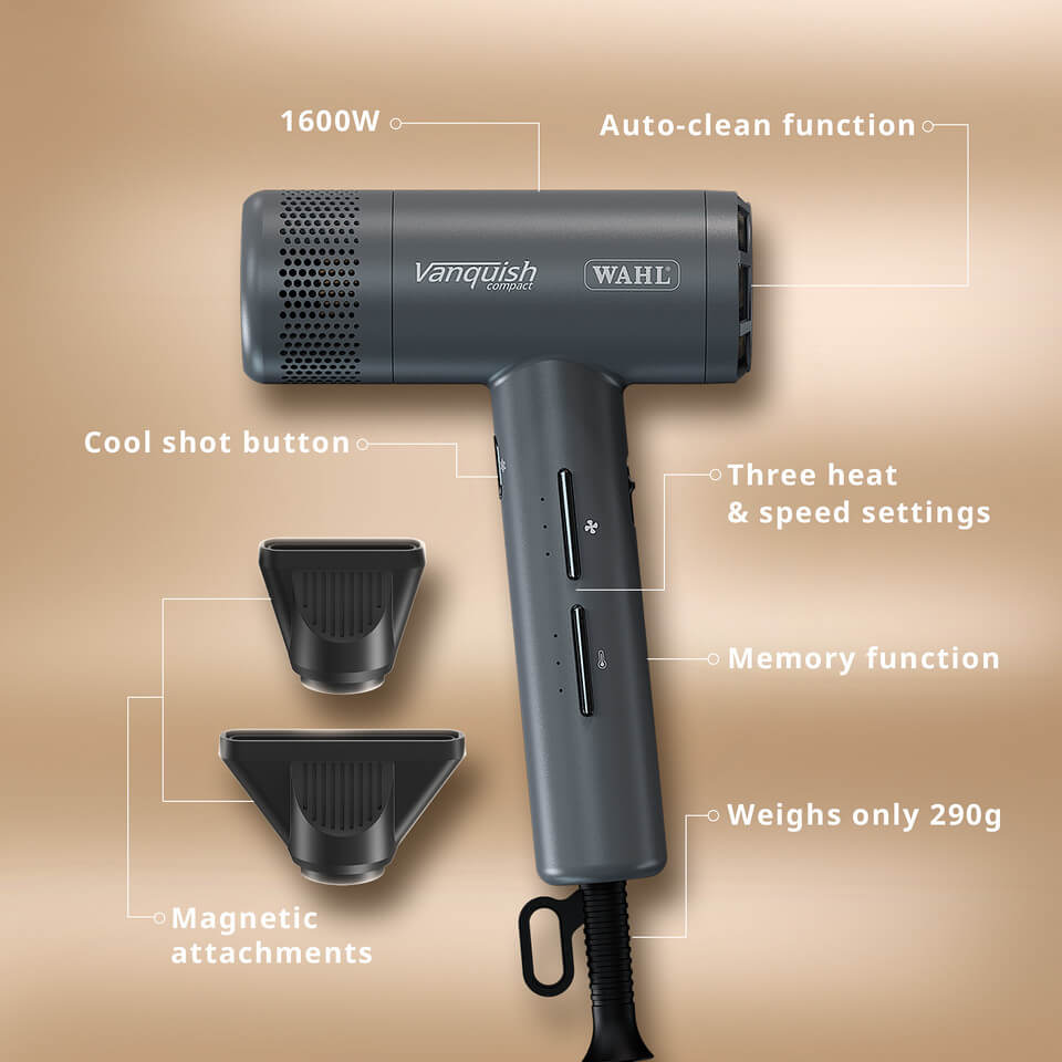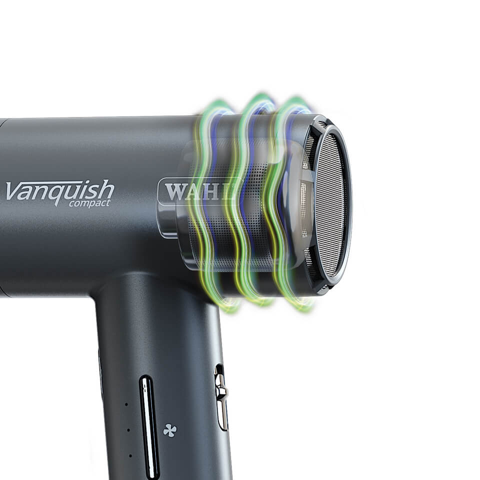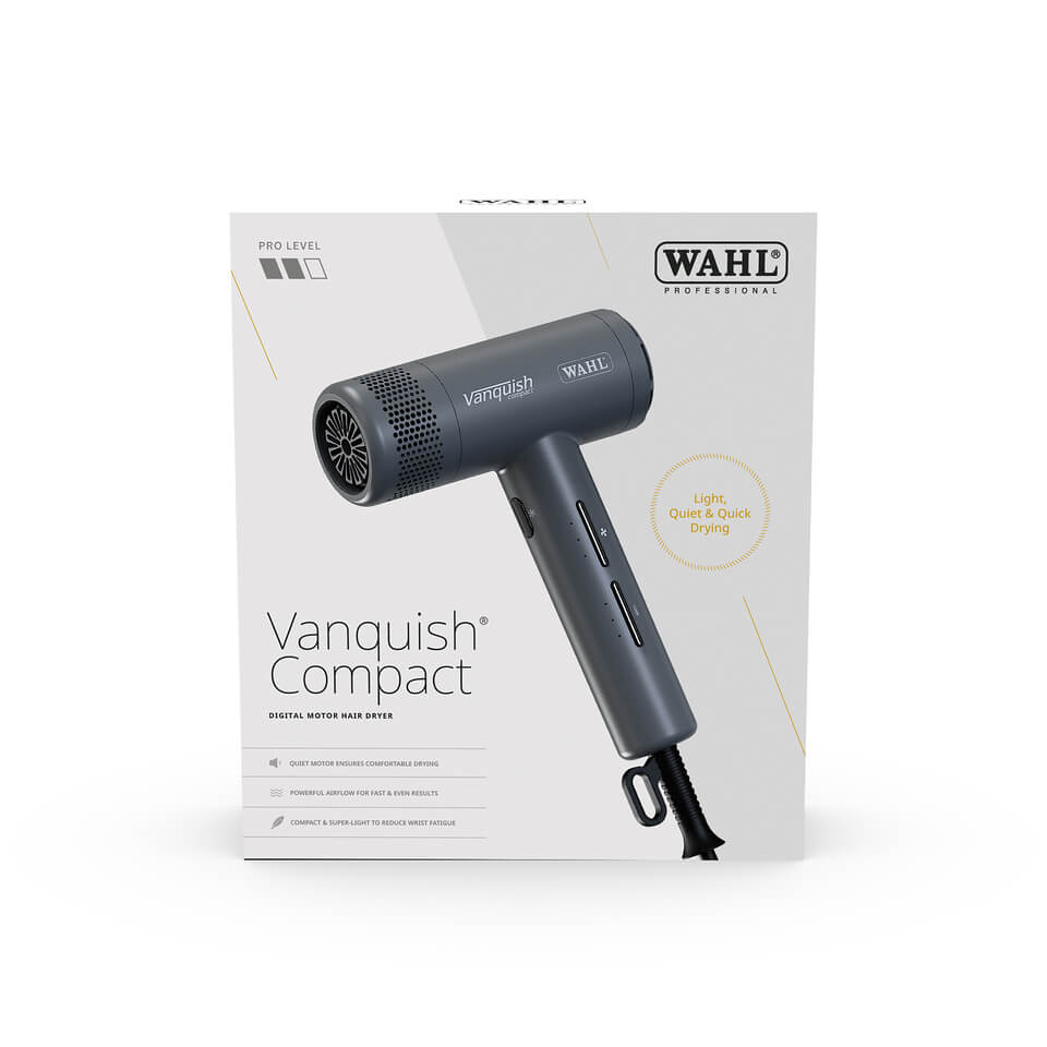 The Vanquish® Compact is Wahl's latest adaptation of the popular Vanquish® digital motor hair dryer that delivers quick & quiet drying in an even lighter design.